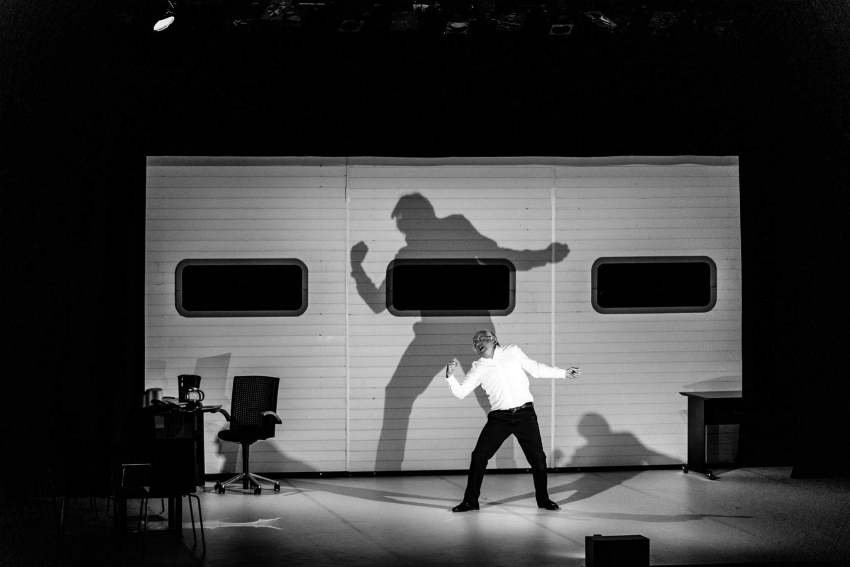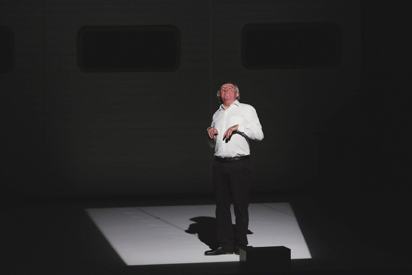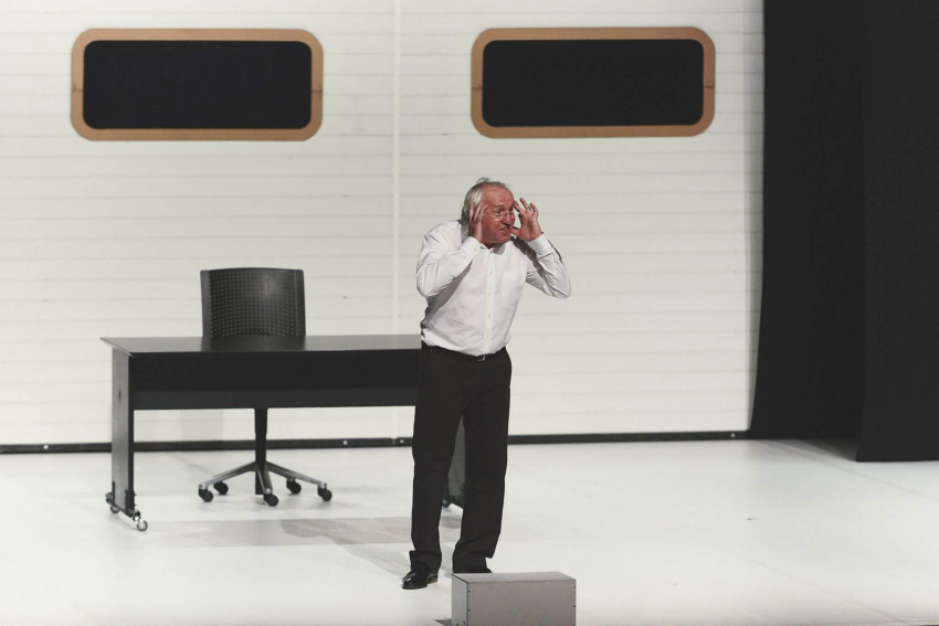 Olivier Saladin, ancien Deschiens, jouant seul une pièce de théâtre conçu comme un monologue gesticulatoire.