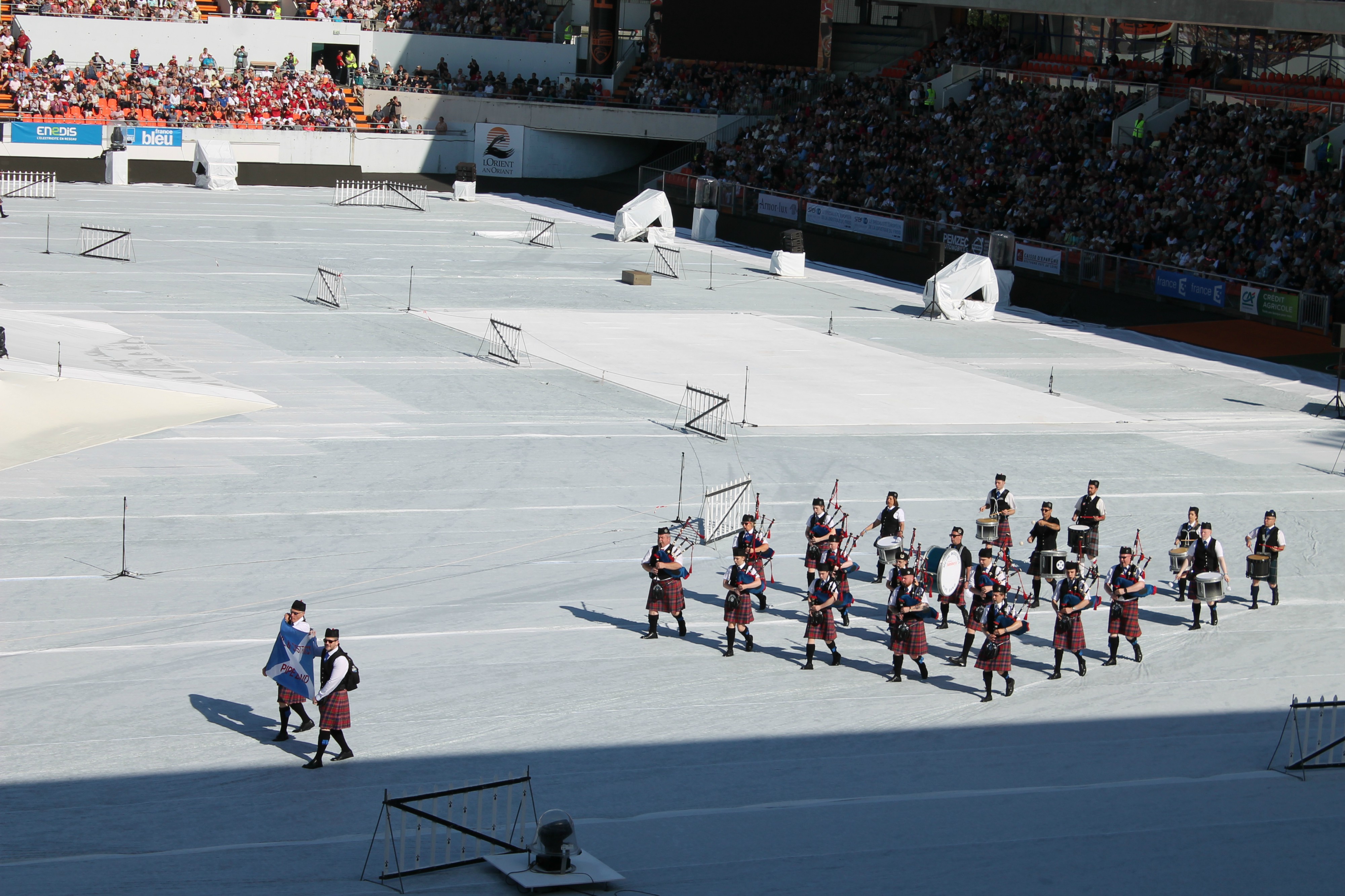 En premier, les drapeaux des différents pays présentés au FIL 2017 accompagné d’une troupe de musiciens et danseurs ont fait leur entrée dans le stade après avoir défilé dans les rues, sous les applaudissements de la foule. Ce fût ensuite le tour des écossais, pays à l’honneur cette année, avec un bagad impressionnant.