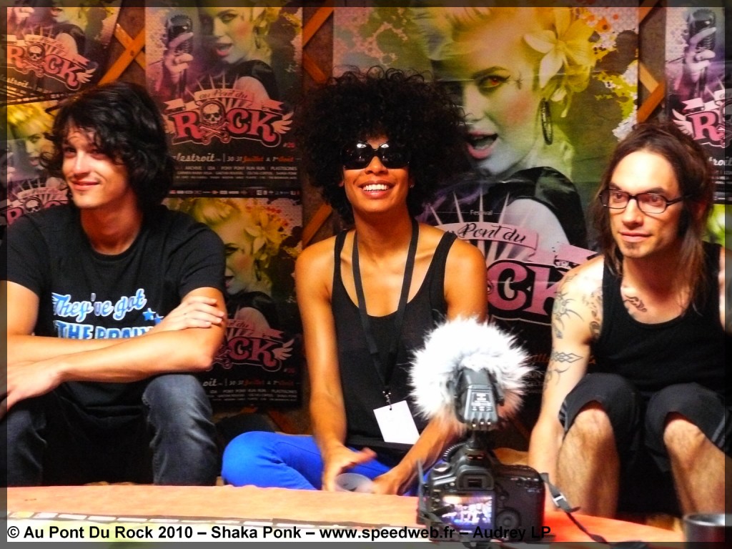 Autre conférence attendu, les Shaka Ponk, avec un quart d’heure de retard… ils dormaient dans leur loge. Là, on fait vite le tour sur leur style musical et on part très vite sur les souvenirs de concerts, avecdes anecdotes assez cocasses à l’étranger souvent : « en Allemagne, on a joué dans un festival très chaud, les organisateurs nous avaient mis une grosse pression, en nous indiquant que si le public n’accrochait pas, on risquait de recevoir des sceaux de pisse sur la scène, c’est comme ça que le public se rebiffe lorsqu’un groupe ne lui plait pas, mais bon on a géré et tout c’est bien passé ! ».