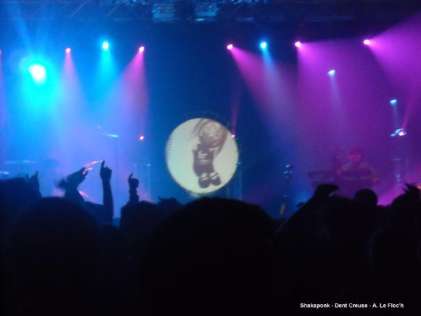 Quatrième concert de la soirée : Shaka Ponk. Comment décrire cela ? Un show que je qualifierais juste d'énorme ! La réaction de ceux qui ne les connaissaient pas encore - où qu'à travers MySpace, qui est trop peu représentatif de leurs qualités musicales, à mon goût - a été à peu près la même : tous sont restés bouche bée, Aurélia et moi y compris. Ils ont un jeu de scène incroyable ! A vrai dire, c'est même un concept : un trampoline trône au milieu de la scène sur lequel défilent des images de Goz, le sixième membre du groupe, un singe fictif. Son, lumière, présence scénique (pour le plaisir de la gente féminine, deux d'entre eux ont fait le show torse-nu, de quoi échauffer les esprits)... Parfait, si on oublie les quelques problèmes de basse. Ils sont ressortis de là trempés de sueur, et je suis prête à parier qu'il en était de même pour les aventuriers des premiers rangs tant l'ambiance était torride. C'est là mon IMMENSE coup de coeur de la soirée, et peut-être même de ces dernières années.