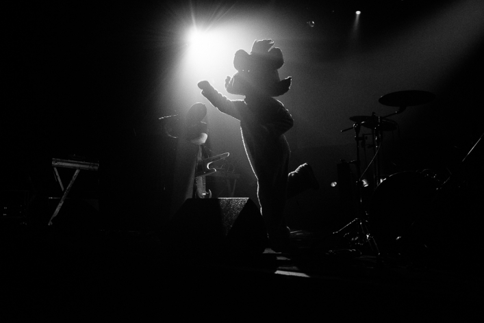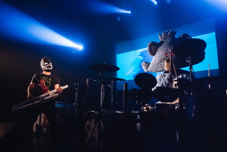 Mon coup de coeur perso ce soir là restera janski beeeats : Le premier signe d’originalité, qui n’est pas des moindres, est dans leur apparence. L'un, guitariste, claviériste et DJ porte un masque en latex noir, une créature aux airs d’alien qui arbore un inquiétant sourire garni de dents, et l'autre, le batteur... c’est un ours ! Un ours bleu électrique avec une tête triangulaire démesurément grande. Dès le premier regard, on sait donc qu’on a affaire à un groupe pour le moins original !