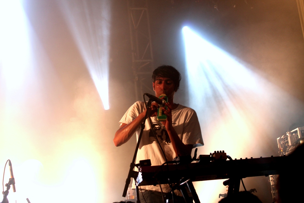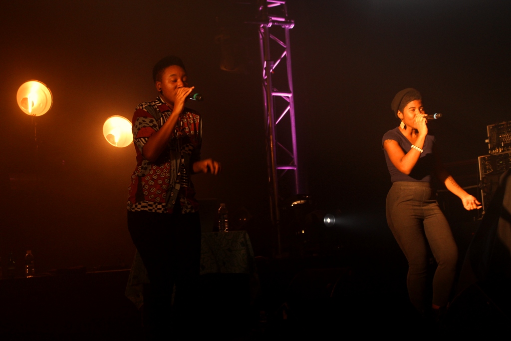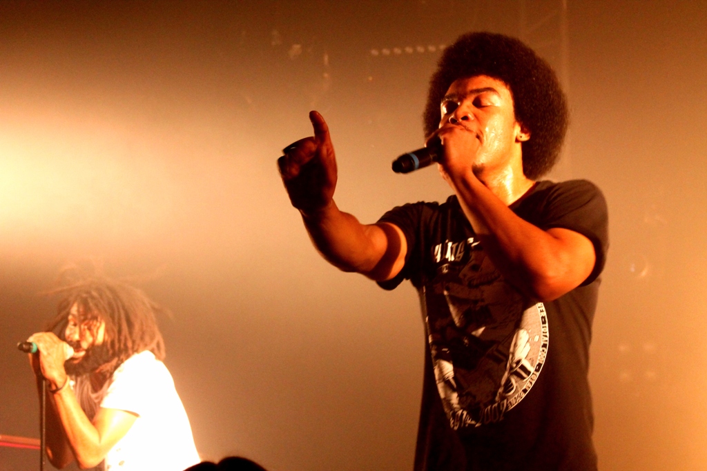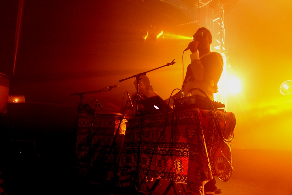 Le leader du groupe, Palaceer Lazaro, est aussi producteur de THEESatisfaction. La où les deux groupes se retrouvent, c'est dans l'envoûtement. Une musique répétitive ponctuée d'une voix lointaine pour un son qui nous enveloppe sans arrêt pendant tout le concert. Visuellement, on s'ennuie un peu. Les deux protagonistes sont derrière leur table de mixage et leurs percussions, et mijotent le son pour le plaisir de nos oreilles uniquement. Il vaut mieux être "dedans" dès la première note pour ne pas décrocher. On ne peut pas dire que ça soit mauvais, loin de là! C'est très riche, et très influencé par la musique indienne, ce qui nous est confirmé par Palaceer Lazaro. "La musique Indienne, je l'adore. Elle sonne bien, a de bons rythmes". C'est sûrement de Shabazz Palace que j'attendais le plus ce soir, d'après ce que j'ai écouté. Mais ils ne m'ont pas apporté davantage que ce que j'avais déjà entendu.