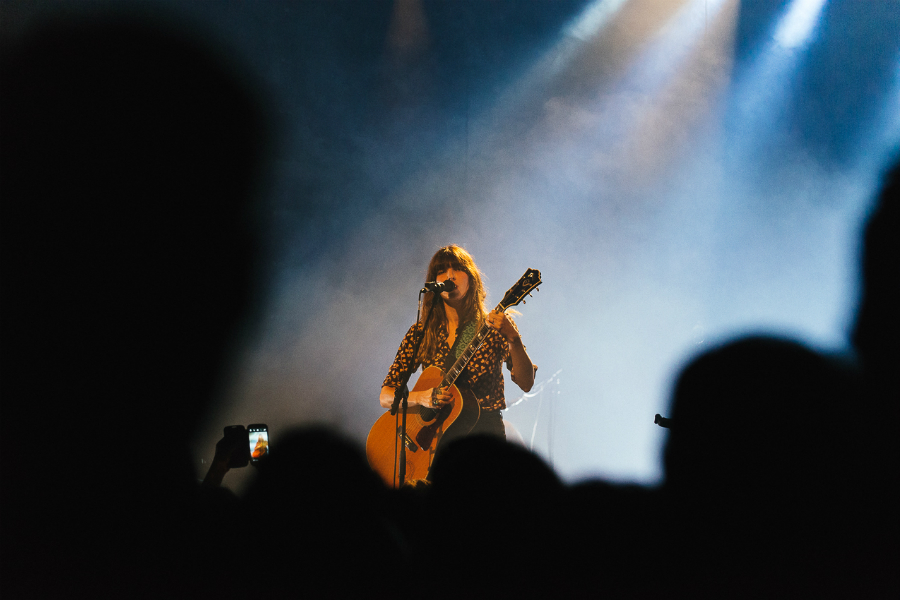 La scène se transforme en une sorte de salon assez "cocooning" avec en fond un drap blanc éclairé par des ampoules suspendues. Lou Doillon arrive après la venue de ses musiciens, le concert commence. Dès les premières notes, on pouvait ressentir une atmosphère intimiste avec une Lou Doillon attachante et sur la réserve.