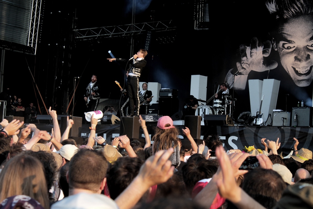 En fait, soyons honnête, même si le festival n'a pas fait complet sur cette première journée, le pari "Rammstein - The Hives" valait vraiment le coup et l'un des 2 a cassé la baraque dans tous le sens du terme. Pour en revenir sur The Hives, on peut dire que la prestation est à la hauteur du groupe, toujours autant capable de faire bouger les foules et toujours aussi sûr d'eux. Habillés en mariachi, pochette du dernier album en fond, lettrage du groupe derrière la batterie, le public n'a pas mis longtemps a apprécier ce groupe construit pour la scène. D'une efficacité redoutable, tout fonctionne, enfin… presque tout, Pablo y met quelques bémols, rien de bien méchant mais la voix de Howlin (chanteur du groupe, vous l'aurez compris) semble un peu fatigué, en même temps, a hurler comme il le fait, elle doit s'user sa petite voix!