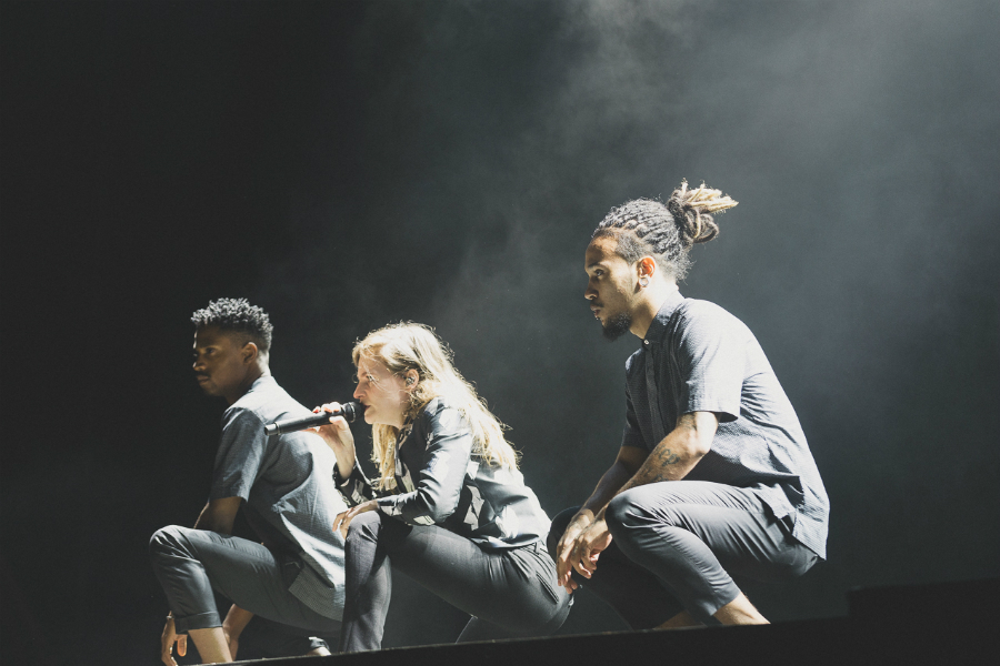 Qualifier la prestation de Christine de "concert" serait bien trop restrictif... En effet, c'est un véritable mélange d'arts sonores et visuels que nous offre la jeune nantaise. Sur la musique envoutante d'un genre hybride se découpent les mouvements saccadés et hypnotisants des danseurs vêtus de gris qui entourent la chanteuse.