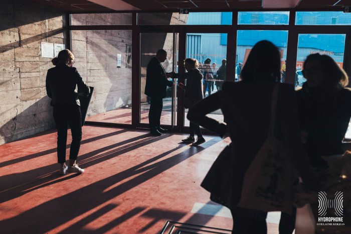 L’entrée est dominée par une grande façade rouge qui nous regarde de haut. Première entrée, premier tampon avec le logo hydrophone. J’aperçois le coin sanitaire, facilement accessible contrairement à celle du Manège (souvenir, souvenir), face à la petite scène qui est en contre bas. Le bar est par là d’ailleurs, j’en profite donc, j’ai mes petits jetons rouges en main !