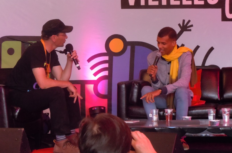 H: Et là tu va jouer sur un trèsgrand festival, sur la scène Graal mais en même temps, t'es habitué ? Tu viens de faire la première partie des Black Eyes Peas au Stade de France, un chanson à Taratata avec Will.I.Am...