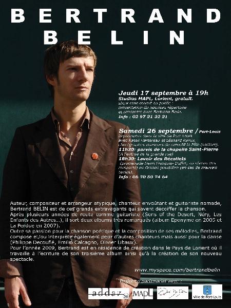 Bertrand Belin est un chanteur/compositeur/guitariste. Il s'insère dans le monde de la musique en jouant pour un groupe canadien:Stompin'crawfish, avec lequel il sort deux albums. Il jouera ensuite dans divers groupes anglais puis français. Il s'affirmera en 1998 en créant son propre groupe, "les enfants des autres". Son premier vrai album sortira en 2003, qu'il composera lui-même et qu'il enregistrera avec des amis cubains.